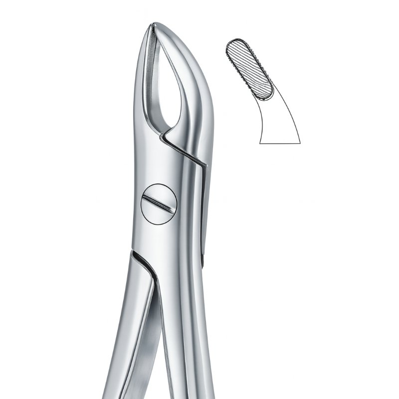 Dental forceps with serrated curved beak for firm grip.