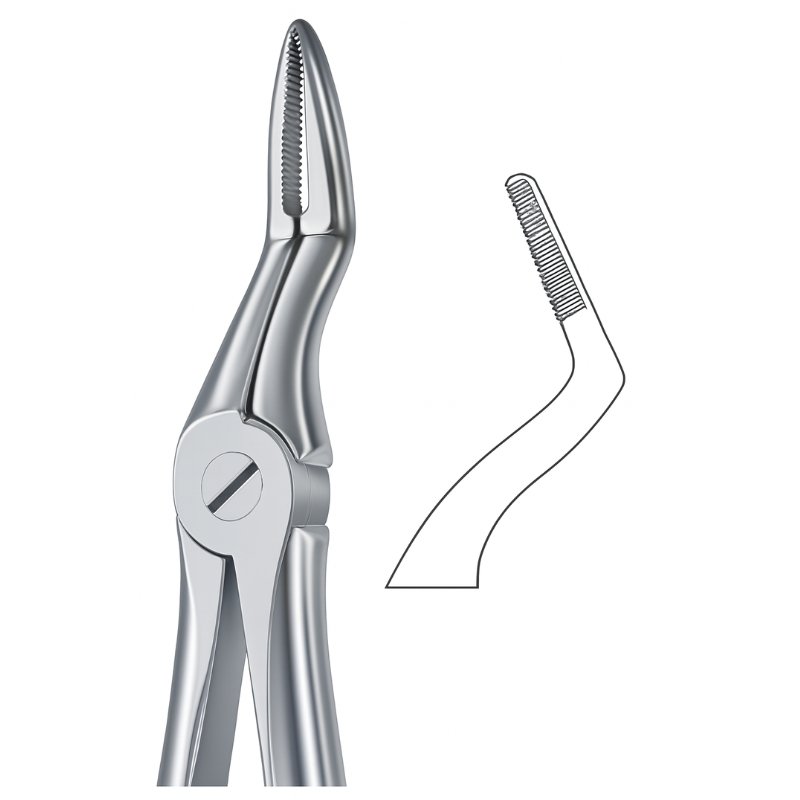 Dental forceps with curved serrated beak. Inset diagram highlights anatomical beak design. Premium stainless steel construction for oral surgery.