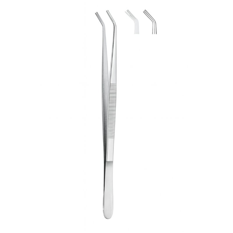 The Angled Multi-View Cotton & Dressing Tweezers are designed for secure handling of cotton rolls, dressings, and other delicate materials during surgical and dental procedures. The angled tips provide enhanced precision and visibility, making them ideal for accessing confined or angled areas. The inset illustrations highlight different tip variations, emphasizing their specialized functions for accurate placement and retrieval.