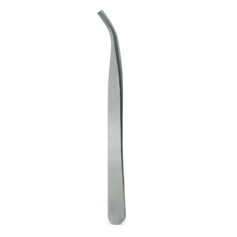 Stainless steel tweezer with curved fine tip for ultra-precise handling in tight or delicate areas.