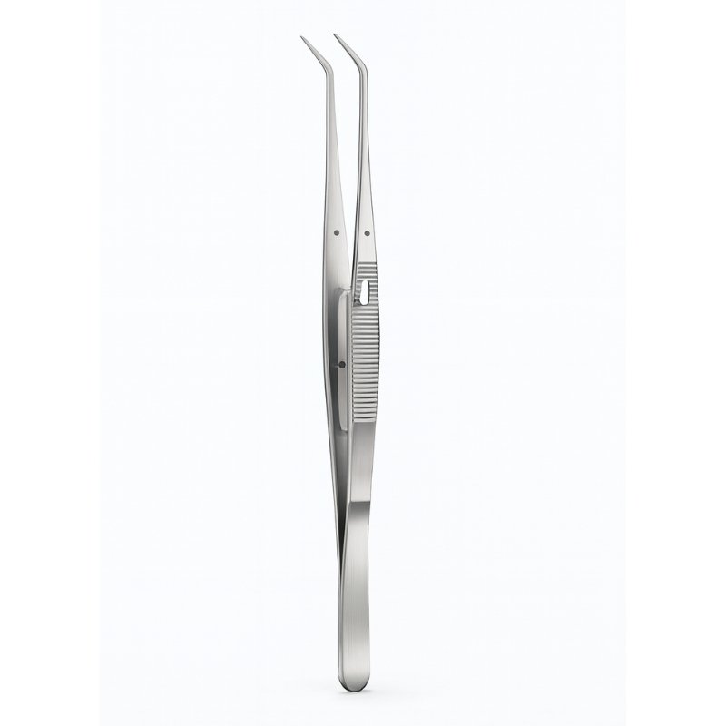 The Angled Surgical Cotton & Dressing Tweezers are designed for delicate handling of cotton rolls, dressings, and other materials during surgical and dental procedures. The angled tips provide enhanced precision and control, allowing easy access to confined or angled areas. The inset illustration highlights the tip design, emphasizing its specialized function for accurate placement and retrieval.