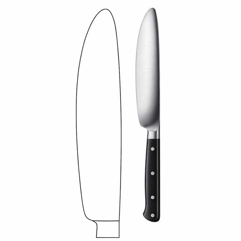 The Broad Blade Surgical Scalpel is designed for precision and strength in surgical procedures. Featuring a wide stainless steel blade with a curved edge, it allows practitioners to perform controlled incisions with minimal effort. The black handle, secured with three rivets, ensures ergonomic comfort and stability during extended use. The accompanying outline diagram highlights the blade’s proportions and curvature for clinical reference.