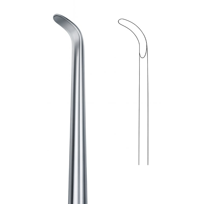 The Cobb Root Elevator – Flat Curved Tip is designed for precision and efficiency during tooth extractions. Its flat curved blade provides controlled loosening of roots and teeth from the periodontal ligament, particularly effective in cases requiring firm leverage and minimal trauma. The inset illustration highlights the blade’s contour, emphasizing its specialized clinical function.