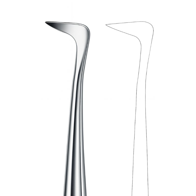 The Curved Blade Root Elevator is engineered to provide precision and leverage during challenging tooth extractions. Its curved blade design allows for controlled loosening of roots and teeth in tight spaces, minimizing trauma to surrounding tissues. The inset illustration highlights the specialized curvature, showcasing its efficiency in clinical practice.