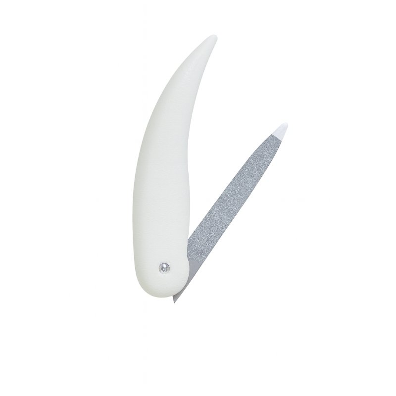Folding nail file with curved white handle and pointed metal tip for shaping and cleaning.