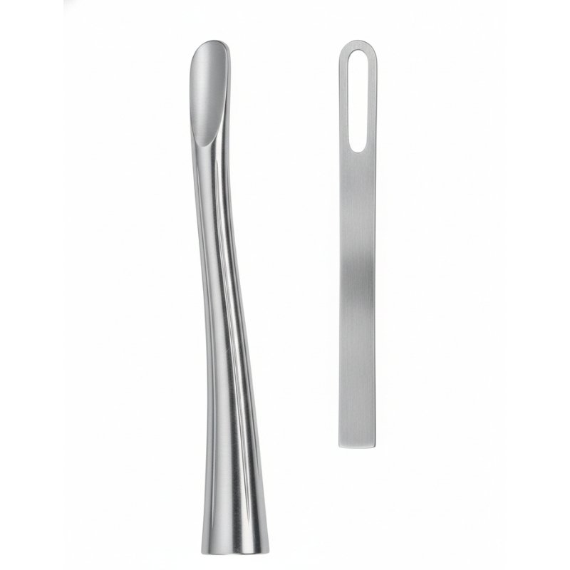 The Curved Concave Root Elevator & Oval-Slot Root Elevator Set is designed for versatility and precision in dental extractions. The concave curved elevator provides smooth, controlled loosening of roots and teeth, while the oval-slot elevator offers enhanced grip and leverage for fragment removal or difficult cases. The outline illustration highlights both working ends, showcasing their complementary functionality in clinical practice.