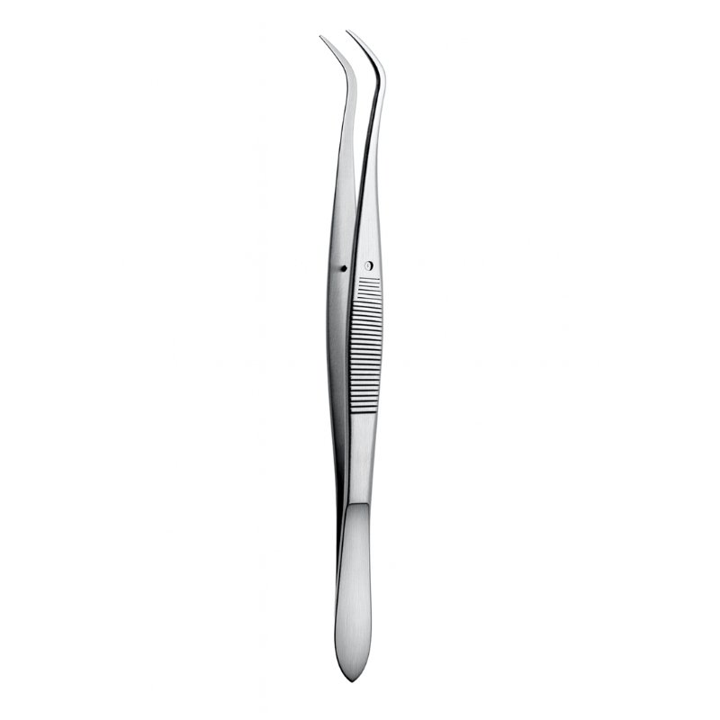 The Curved Dressing Tweezers are designed for secure handling of cotton rolls, dressings, and other delicate materials during surgical and dental procedures. The curved tips provide enhanced control and precision, allowing easy access to confined or angled areas. The inset illustration highlights the tip design, emphasizing its specialized function for accurate placement and retrieval.
