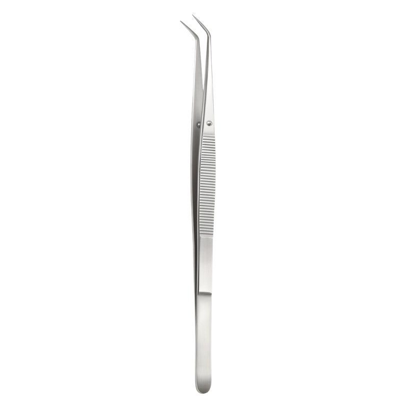 The Curved Grip Cotton & Dressing Tweezers are designed for secure handling of cotton rolls, dressings, and other delicate materials during surgical and dental procedures. The curved tips provide enhanced control and precision, allowing easy access to confined or angled areas. The inset illustration highlights the tip design, emphasizing its specialized function for accurate placement and retrieval.
