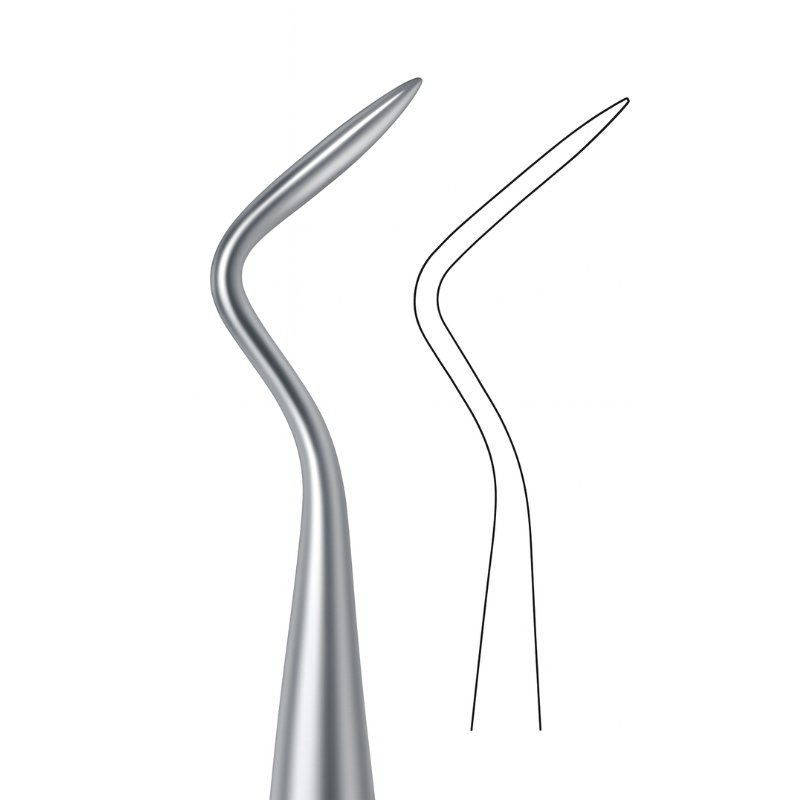 The Curved Probe Root Elevator is designed for precision and control during tooth extractions. Its curved, pointed blade provides effective loosening of roots and teeth from the periodontal ligament, particularly useful in cases requiring delicate maneuvering and minimal trauma. The outline illustration highlights the blade’s curvature, emphasizing its efficiency in clinical practice.