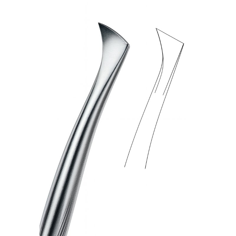 The Curved Root Elevator – Slim Handle is designed for precision and efficiency during tooth extractions. Its sharp curved blade provides controlled loosening of roots and teeth from the periodontal ligament, particularly effective in cases requiring delicate insertion and minimal trauma. The inset illustration highlights the blade’s curvature, emphasizing its specialized clinical function.