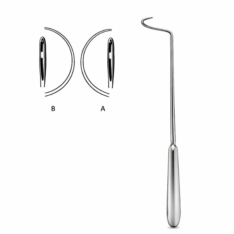 The Curved Tip Dental Explorer is designed for precision in dental examinations and hygiene procedures. Featuring a long stainless steel handle with a thin curved tip, it allows practitioners to detect cavities, calculus, and irregularities on tooth surfaces with exceptional accuracy. The accompanying diagrams (A and B) demonstrate how the instrument tip engages with teeth at different angles, highlighting its clinical application.