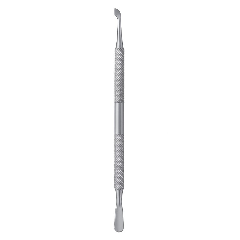 The Cuticle Curve-Point Dual Pusher is a precision grooming tool designed for efficient nail care and cuticle management. One end features a flat, curved blade that gently pushes and shapes cuticles, while the opposite end offers a pointed tip for cleaning under nails and refining narrow contours. This dual-function layout supports both cosmetic detailing and hygienic maintenance in professional manicure and pedicure routines.