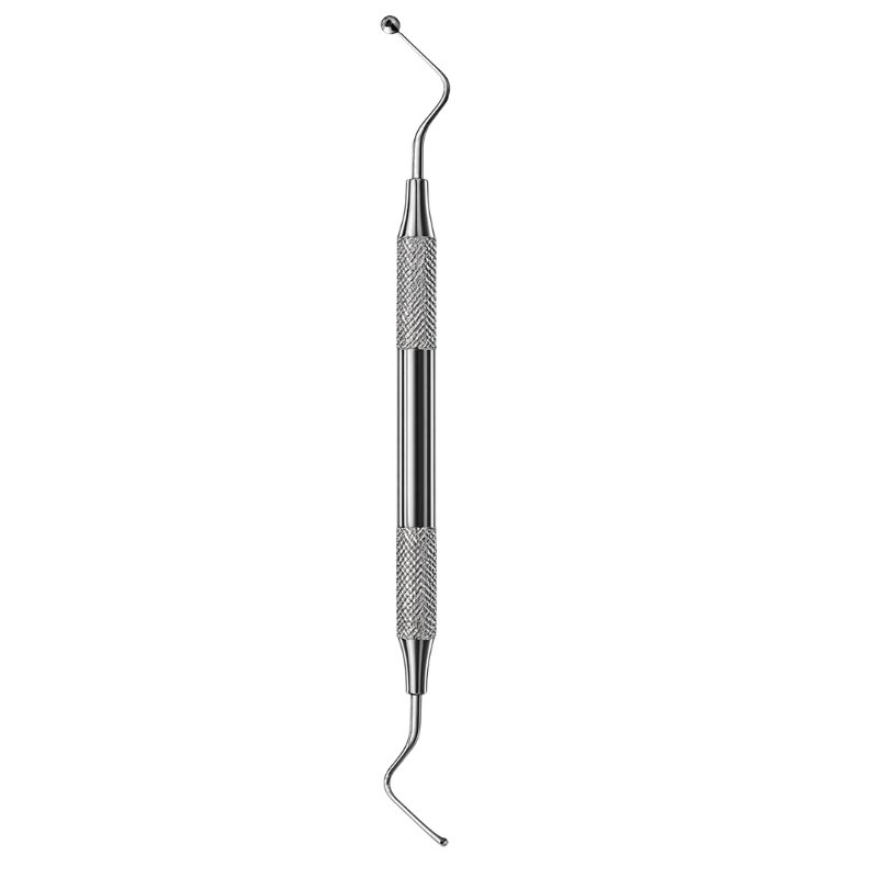 Bone curette with one ball tip and one curved pointed tip.