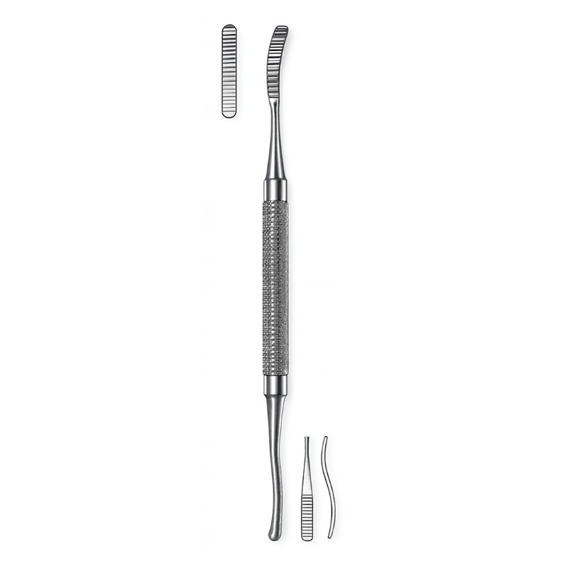 The Double Ended Grooved Bone File is designed for precision shaping and contouring of bone surfaces in oral and maxillofacial surgery. Each end features flat curved tips with parallel grooves, allowing controlled filing and smoothing of bone structures. The inset illustrations highlight the grooved design, emphasizing its specialized surgical function.