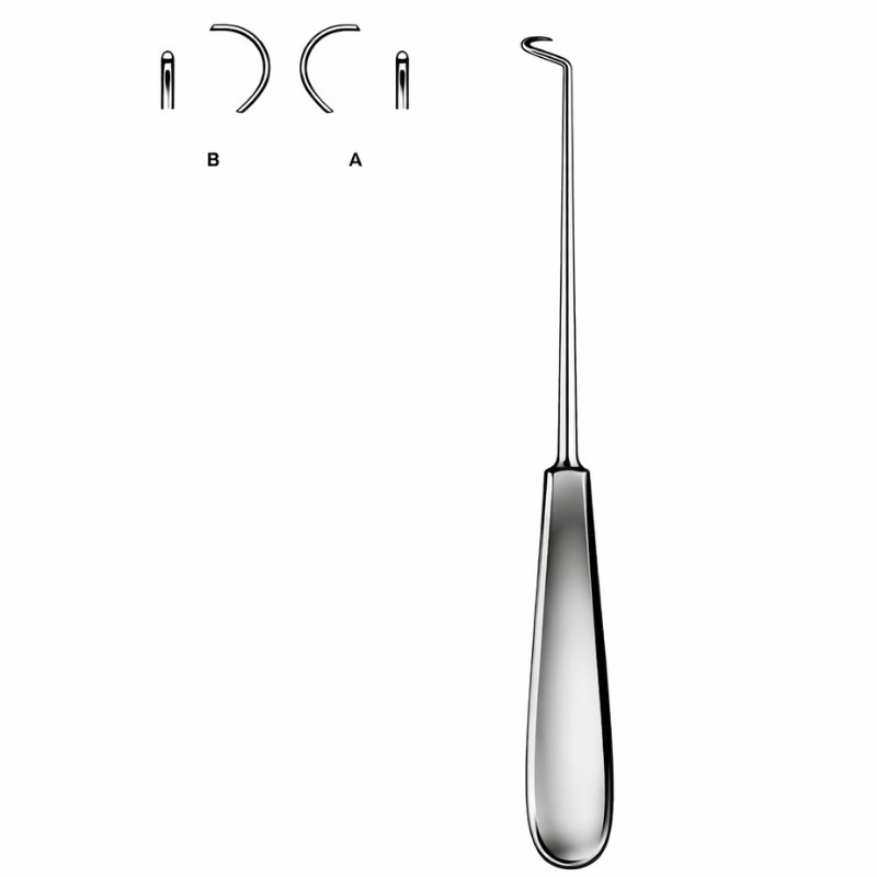 The Dual Curve Cystic Dissector is designed for precision and control in biliary and laparoscopic surgeries. Featuring a long slender stainless steel shaft with a curved hook tip, it allows practitioners to engage, isolate, and manipulate ducts or vessels with minimal trauma. The illustrated variations (A and B) highlight different hook curvatures, offering surgeons flexibility in selecting the most suitable design for specific procedures.