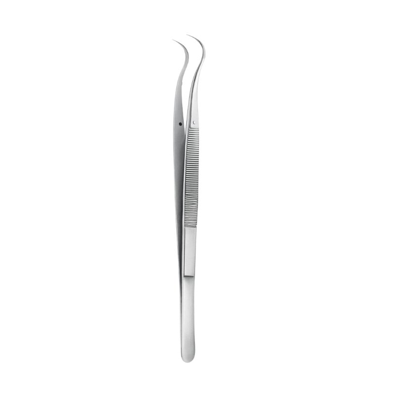 The Dual Curved Cotton & Dressing Tweezers are designed for secure handling of cotton rolls, dressings, and other delicate materials during surgical and dental procedures. The dual curved tips provide enhanced control and precision, allowing easy access to confined or angled areas. The inset illustration highlights the tip design, emphasizing its specialized function for accurate placement and retrieval.