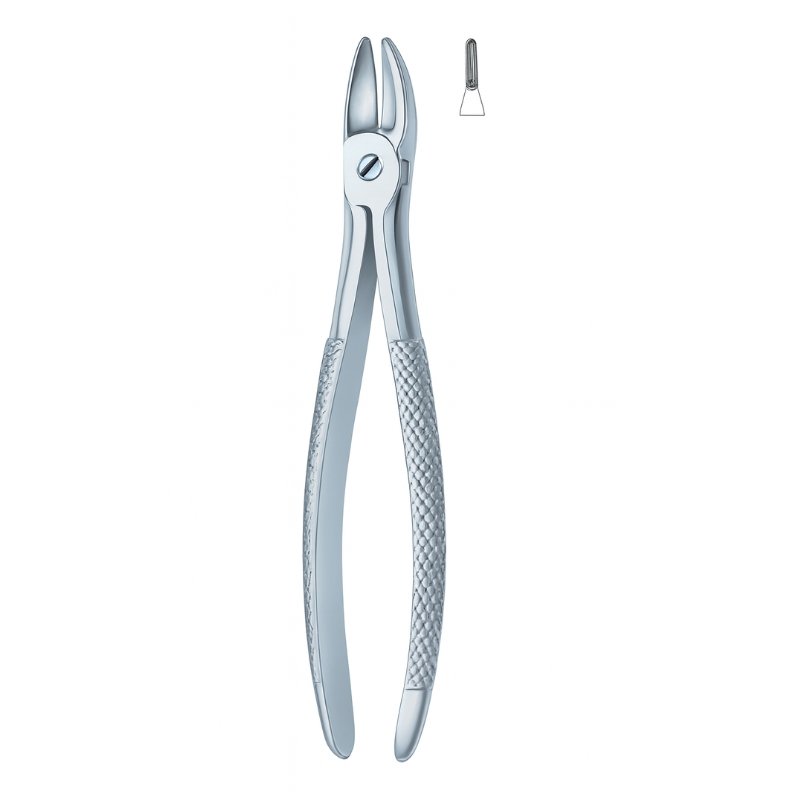 Dental forceps with serrated beak for firm grip.