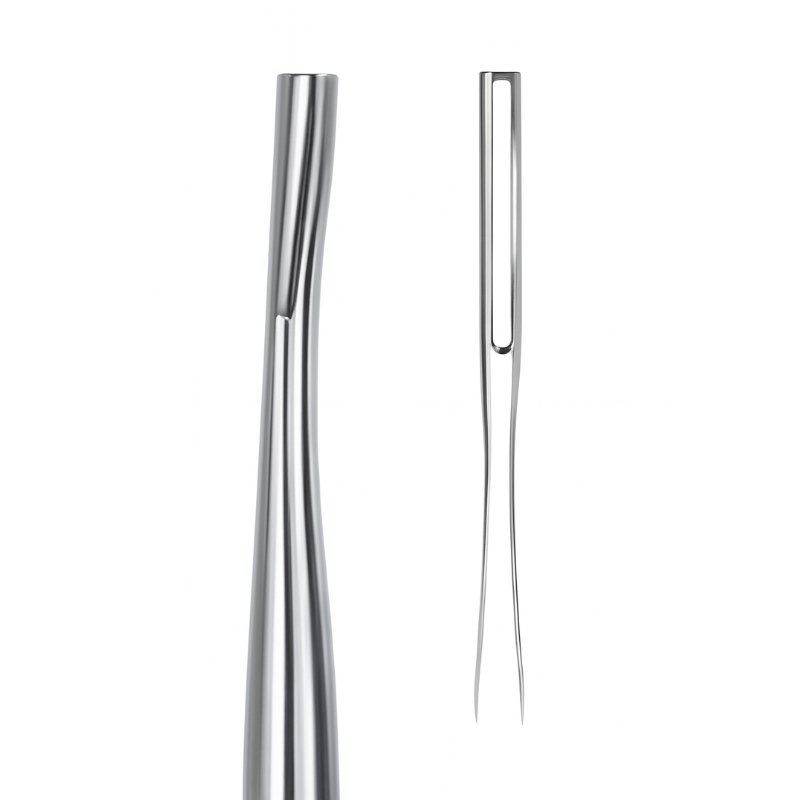 The Dual-Pronged Root Elevator with Oval-Slot Handle is designed for precision and versatility during tooth extractions. Its dual pronged blade provides enhanced grip and leverage for loosening roots and fragments, particularly effective in cases requiring controlled maneuvering and minimal trauma. The outline illustration highlights the forked contour, emphasizing its efficiency in clinical practice.
