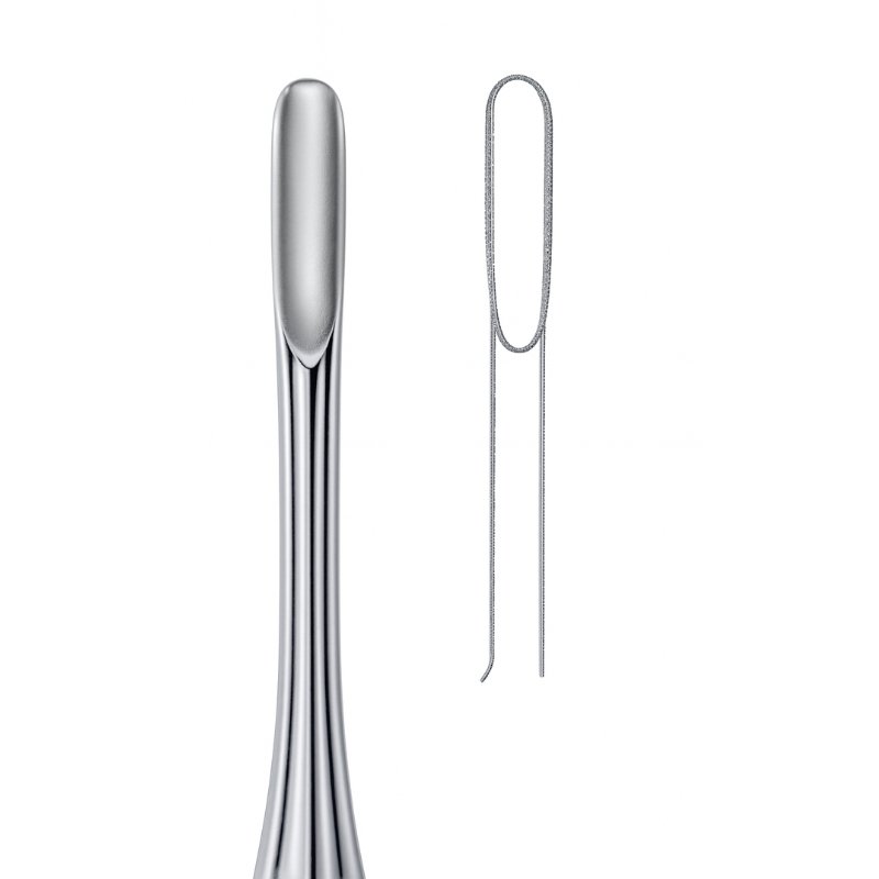 The Elongated Eye Root Elevator is designed for precision and control during tooth extractions. Its narrow, oval-shaped blade provides effective loosening of roots and teeth from the periodontal ligament, particularly useful in delicate cases requiring minimal trauma. The inset illustration highlights the blade’s elongated contour, emphasizing its efficiency in clinical practice.