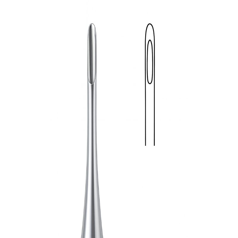 The Eye-Tip Root Elevator with Slim Handle is designed for precision and control during tooth extractions. Its elongated eye-shaped blade provides effective loosening of roots and teeth from the periodontal ligament, particularly useful in cases requiring delicate maneuvering and minimal trauma. The outline illustration highlights the blade’s unique contour, emphasizing its efficiency in clinical practice.
