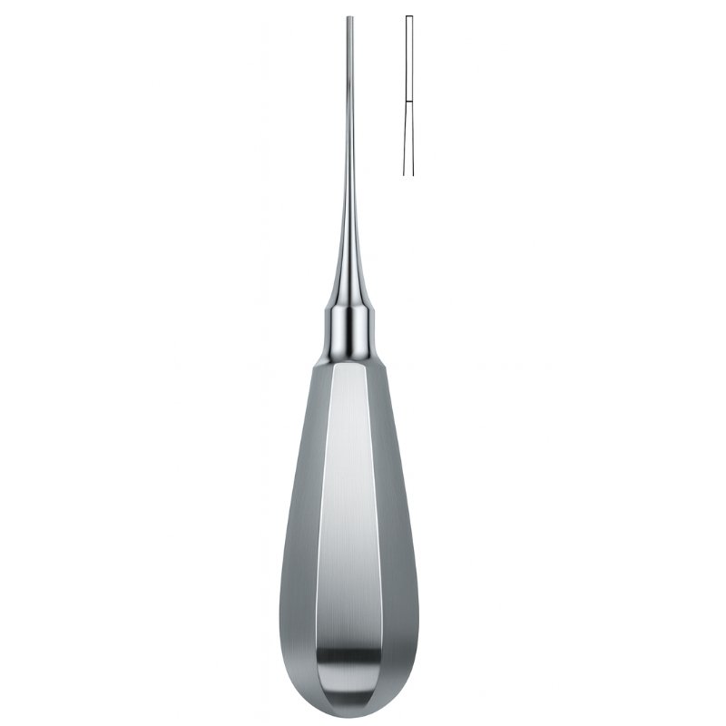The Flat Blade Root Elevator with Broad Ergonomic Handle is designed for precision and efficiency during tooth extractions. Its tapered flat blade provides controlled loosening of roots and teeth from the periodontal ligament, particularly effective in cases requiring delicate insertion and minimal trauma. The inset illustration highlights the blade’s slim profile, emphasizing its specialized clinical function.