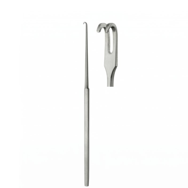 Latch hook ensures secure tissue retraction. Slender handle allows precise control. Durable stainless steel construction.
