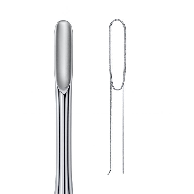 The Looped Wire Root Elevator with Solid Handle is designed for precision and versatility in dental extractions. Its elongated wire loop blade provides controlled loosening of roots and fragments, while the solid metallic handle ensures stability and leverage during delicate procedures. The inset illustration highlights the streamlined contour, emphasizing its efficiency in clinical practice.