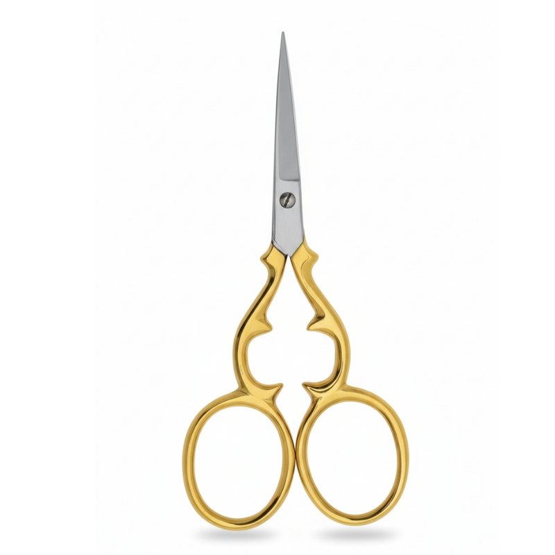 Metalta’s ornate gold scroll scissors combine vintage elegance with sharp precision. Featuring decorative curved handles and pointed silver blades, they’re ideal for embroidery, grooming, and detailed craftwork.
