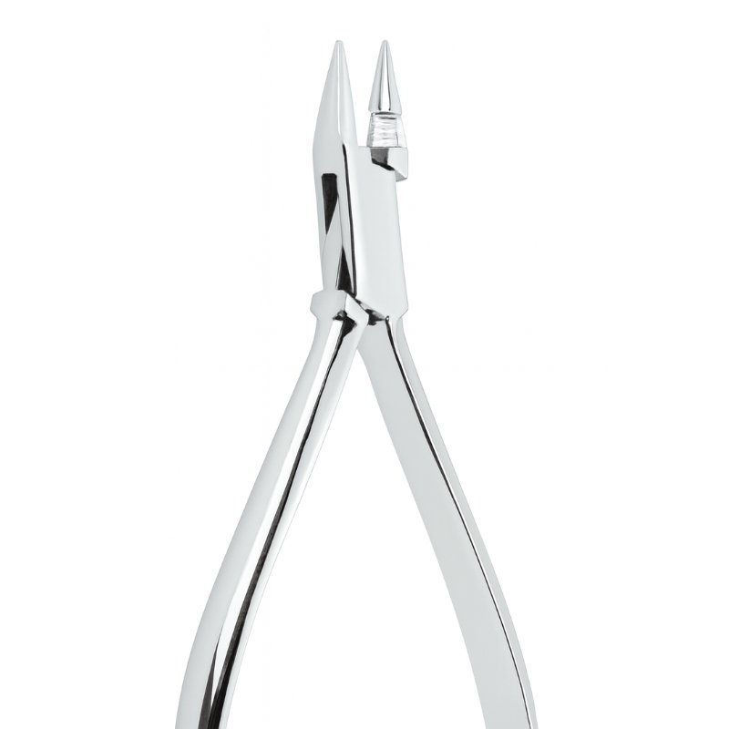 This orthodontic plier is designed for bending, cutting, and adjusting wires with precision during orthodontic procedures. The pointed tips and grooved gripping surface ensure firm control, making it ideal for tasks such as shaping archwires or fine adjustments in braces. The inset illustration highlights the tip design, emphasizing its specialized function for accuracy and consistency.