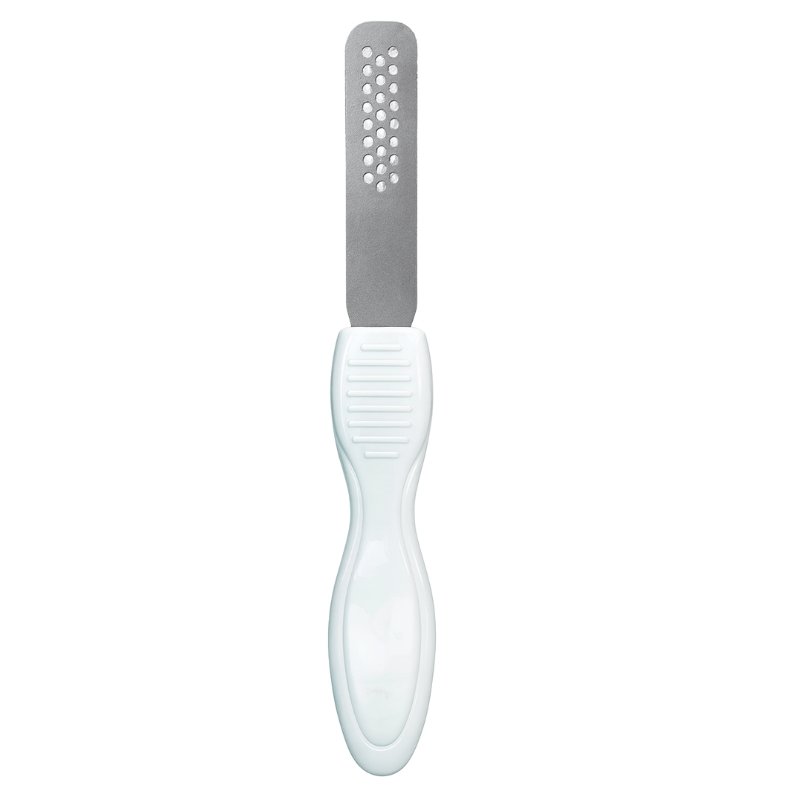 Foot nail file with white handle and perforated metal surface for exfoliating and smoothing.