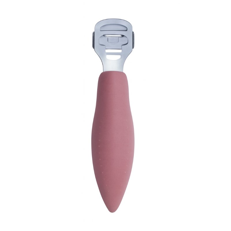 Callous remover with stainless steel head and soft pink rubberized handle.