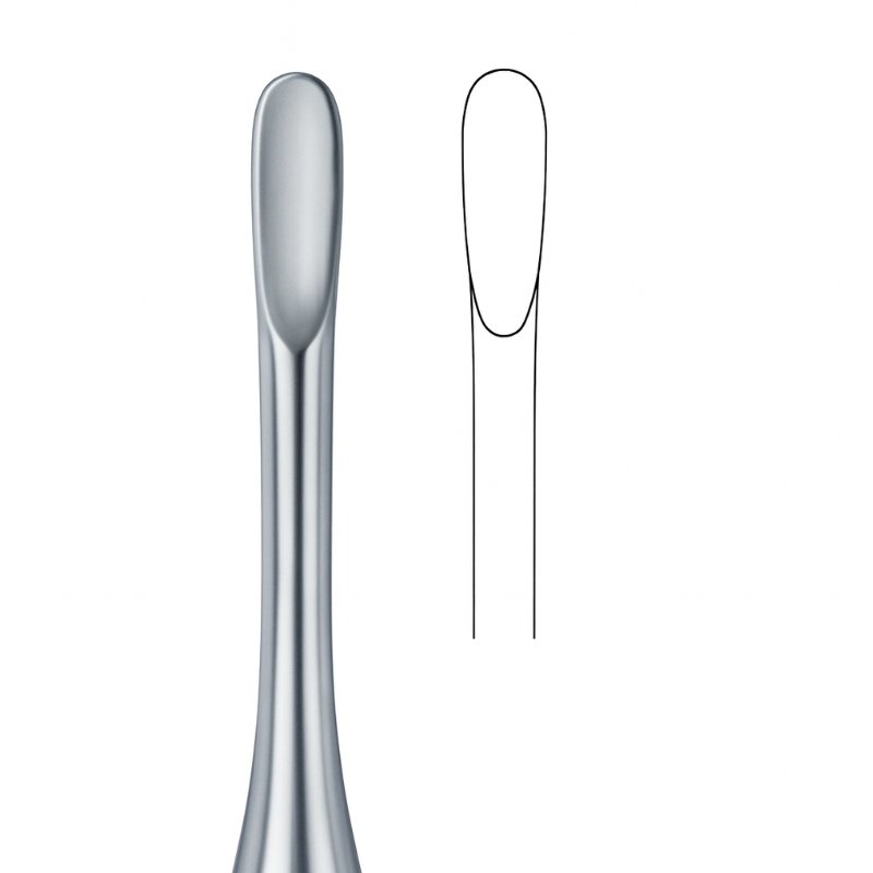 The Rounded Tip Root Elevator is designed for precision and leverage during tooth extractions. Its elongated, rounded blade provides controlled loosening of roots and teeth, particularly effective in cases requiring gentle pressure and minimal trauma to surrounding tissues. The inset illustration highlights the blade’s symmetrical contour, emphasizing its efficiency in clinical practice.