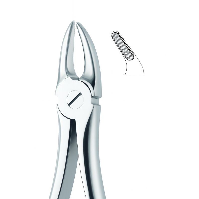Dental forceps with contoured serrated beak for secure grip.