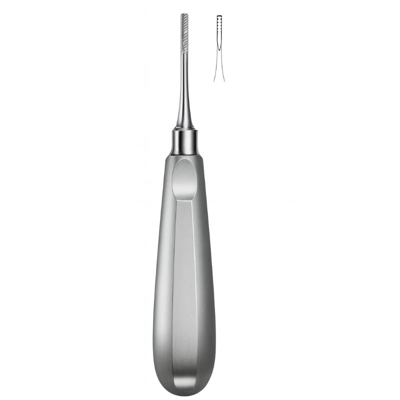The Serrated Tip Root Elevator is designed for enhanced grip and precision during tooth extractions. Its slender, curved blade with serrated edges allows controlled loosening of roots and fragments from the periodontal ligament, reducing slippage and improving efficiency in complex cases. The inset illustration highlights the blade’s specialized serrations, emphasizing its clinical effectiveness.