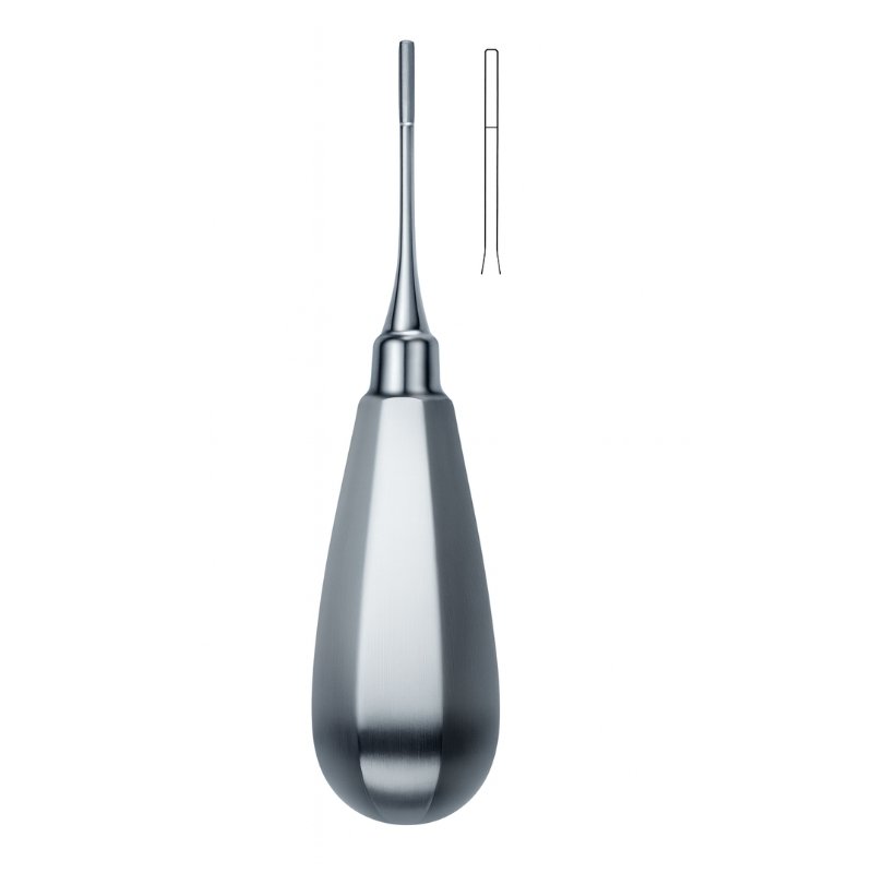 The Straight Blade Root Elevator with Teardrop Handle is designed for precision and leverage during tooth extractions. Its narrow, straight blade with a bifurcated tip allows controlled loosening of roots and teeth from the periodontal ligament, particularly effective in cases requiring direct access and minimal tissue trauma. The inset illustration highlights the blade’s specialized structure, emphasizing its clinical efficiency.