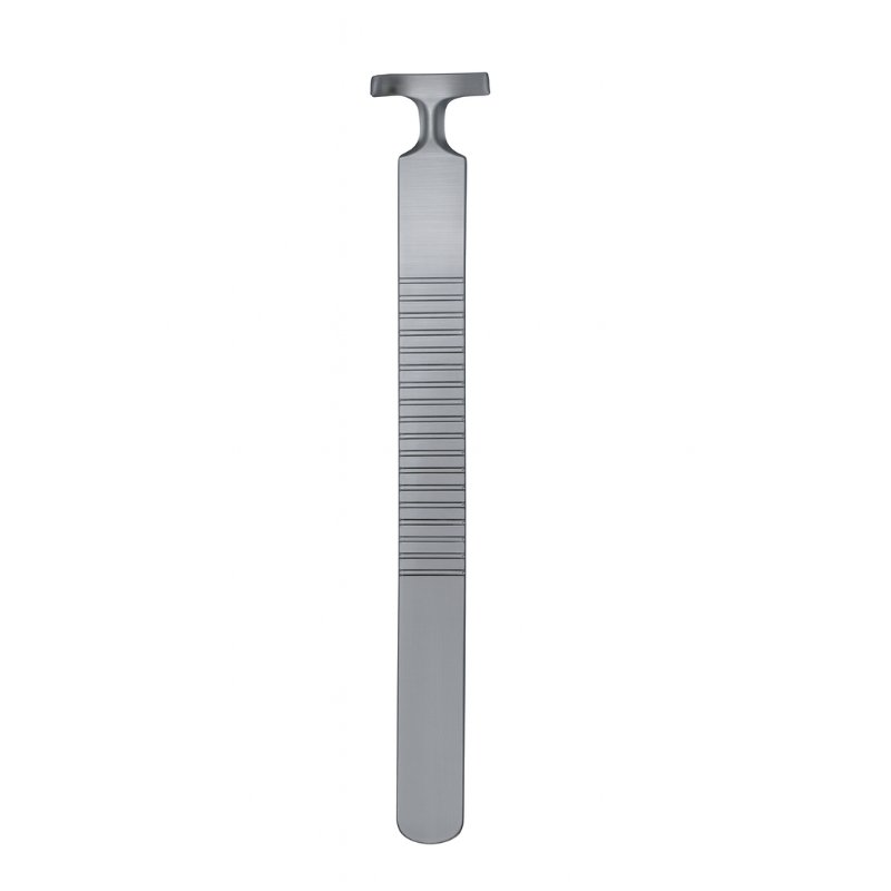 Flat-edged tool for lifting blackheads with guided depth precision.
