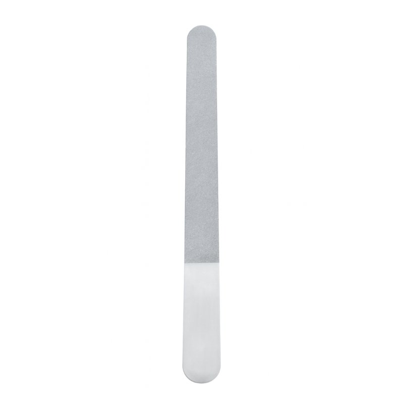 Stainless steel nail file with fine abrasive surface for shaping and smoothing nail edges.