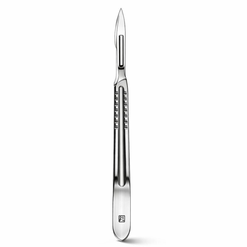The Textured Grip Surgical Scalpel is designed for precision and reliability in surgical procedures. Featuring a stainless steel handle with a textured grip, it provides enhanced control and stability during delicate incisions. The detachable blade ensures versatility, while the measurement markings and model number “21” offer clear identification for clinical use.
