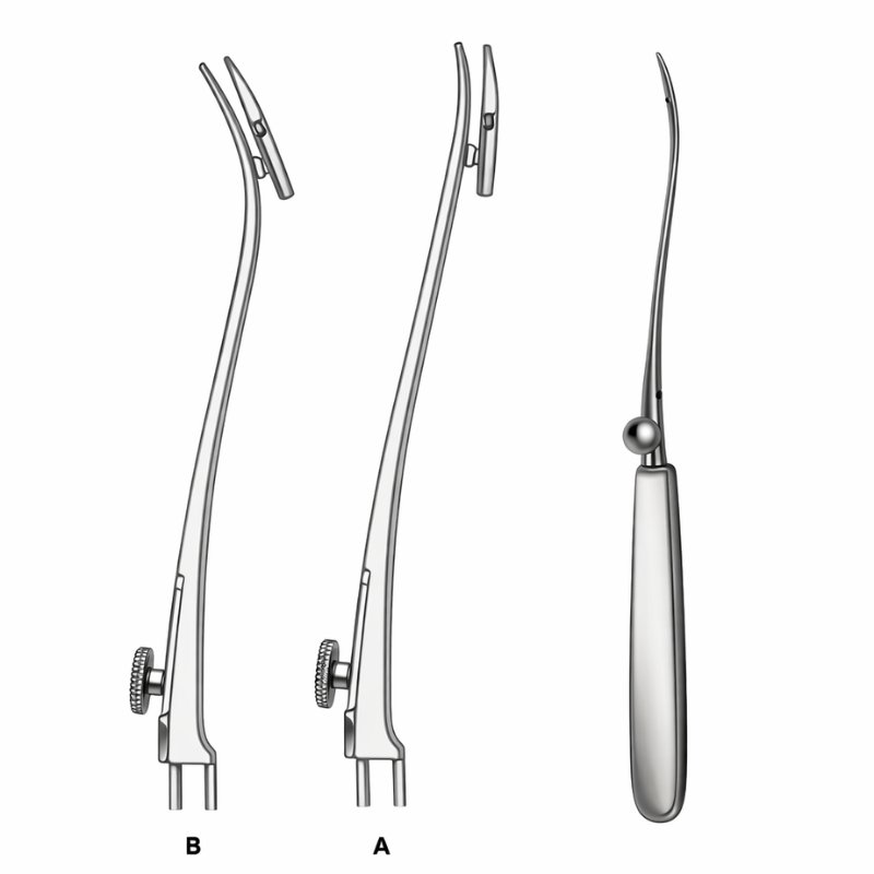 The Triple Design Micro Instruments are engineered for accuracy and adaptability in microsurgical procedures. Instruments A and B feature slender shafts with fine tips and integrated screw mechanisms, allowing practitioners to adjust grip tension for precise control. Instrument C incorporates a spherical joint with a smooth handle, offering enhanced maneuverability and stability during delicate dissections or retractions.
