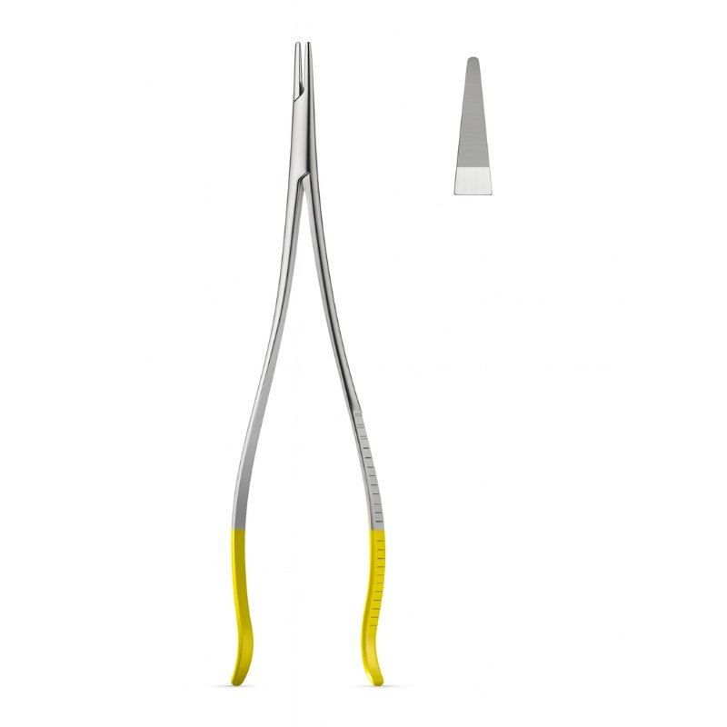 This orthodontic forceps is designed for precision handling in dental and surgical procedures. The narrow tapered jaws with a flat serrated surface provide secure grip on wires or small components, ensuring accuracy in adjustments and placements. The elongated stainless steel body offers smooth control, while the yellow‑accented handles indicate tungsten carbide reinforcement for superior strength and longevity.