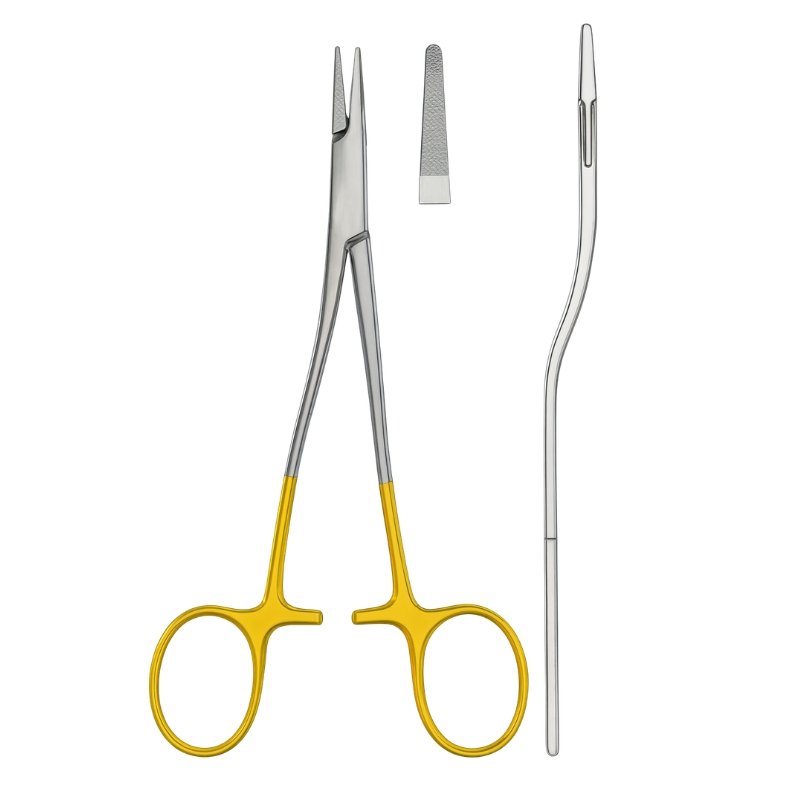 This premium needle holder is designed for precise control during suturing procedures. The textured jaws provide a firm grip on the needle, preventing slippage and ensuring accuracy in delicate surgical tasks. The scissor‑style ring handles and integrated locking mechanism allow practitioners to maintain steady control throughout wound closure. The gold‑accented handles indicate tungsten carbide inserts, which deliver superior strength and extended instrument life.