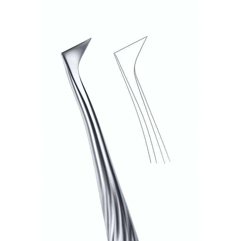 The Twisted Root Elevator – Slim Handle is designed for precision and efficiency during tooth extractions. Its spiral twisted blade provides enhanced grip and controlled loosening of roots and teeth from the periodontal ligament, particularly effective in cases requiring delicate maneuvering and minimal trauma. The inset illustration highlights the blade’s angular tip, emphasizing its specialized clinical function.