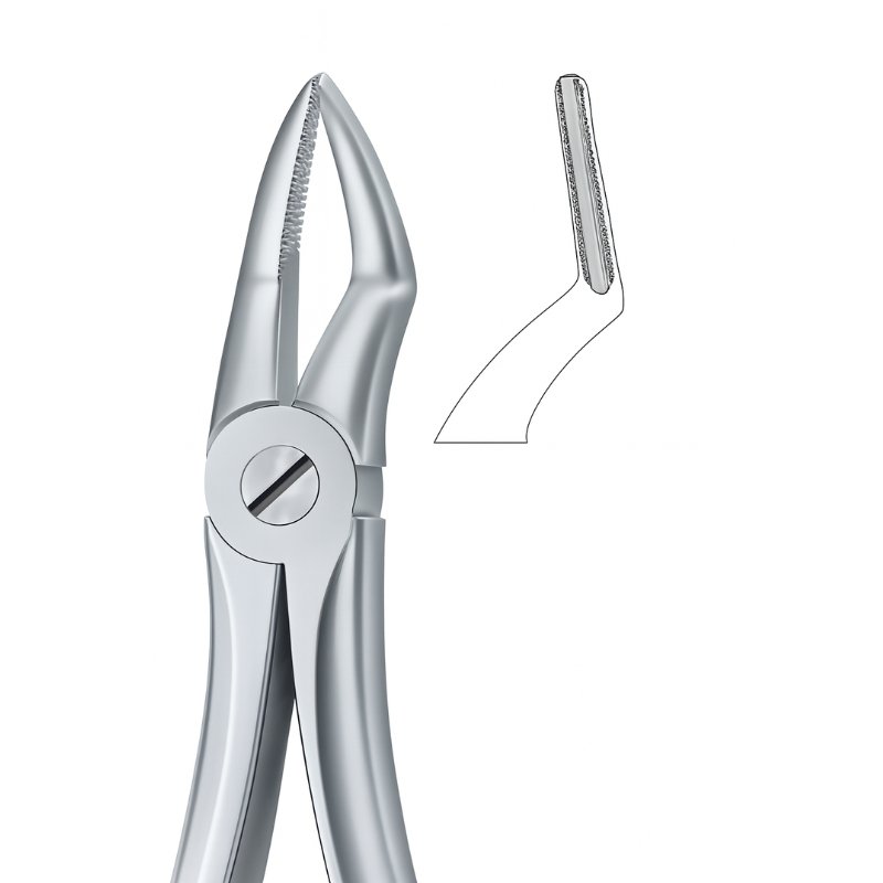 The Upper Anterior Serrated Dental Forceps are engineered for precision and control in anterior tooth extractions. Featuring a contoured beak with serrated inner surfaces, these forceps conform to the natural tooth shape, ensuring a firm and stable hold during removal. The inset diagram highlights the specialized design, showcasing its efficiency for upper anterior applications.