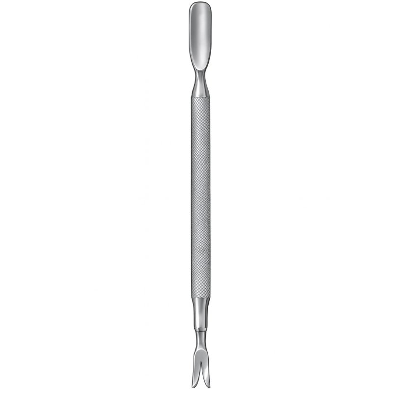 V-End Dual Chiropody Pusher is designed for podiatric professionals and grooming specialists who require accuracy and control. One end features a flat, rounded pusher for gently repositioning cuticles, while the opposite end presents a V-shaped edge ideal for scraping and refining excess tissue around the nail bed. The textured handle ensures a secure grip, allowing for steady performance during detailed procedures.
