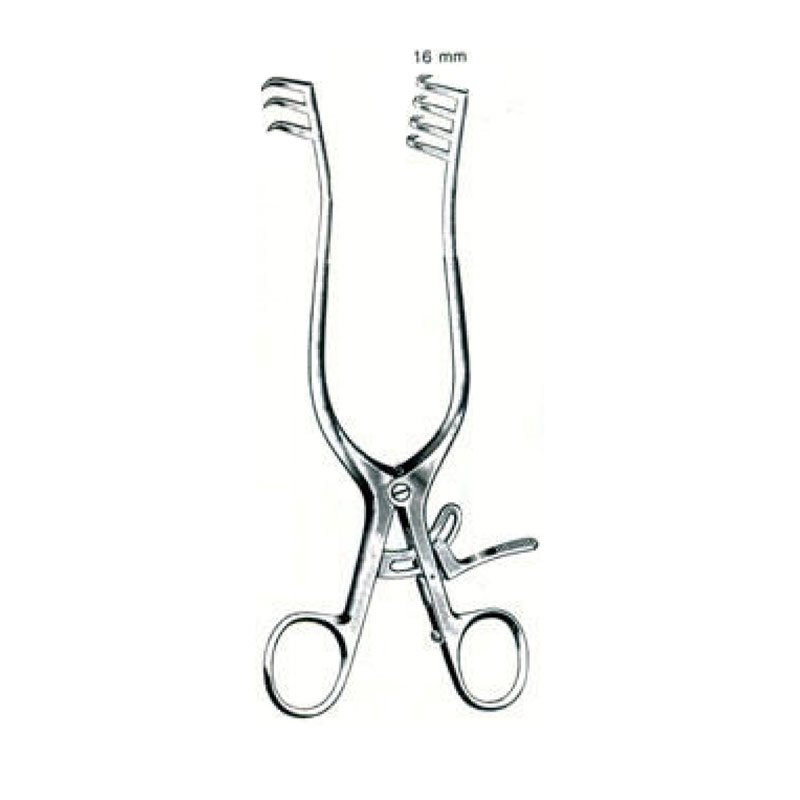 Featuring a ratchet-locking mechanism, the retractor maintains steady separation without manual effort, providing a clear view of the surgical site. The prongs are spaced and shaped for firm yet gentle retraction, supporting precise work in deeper or broader incisions.